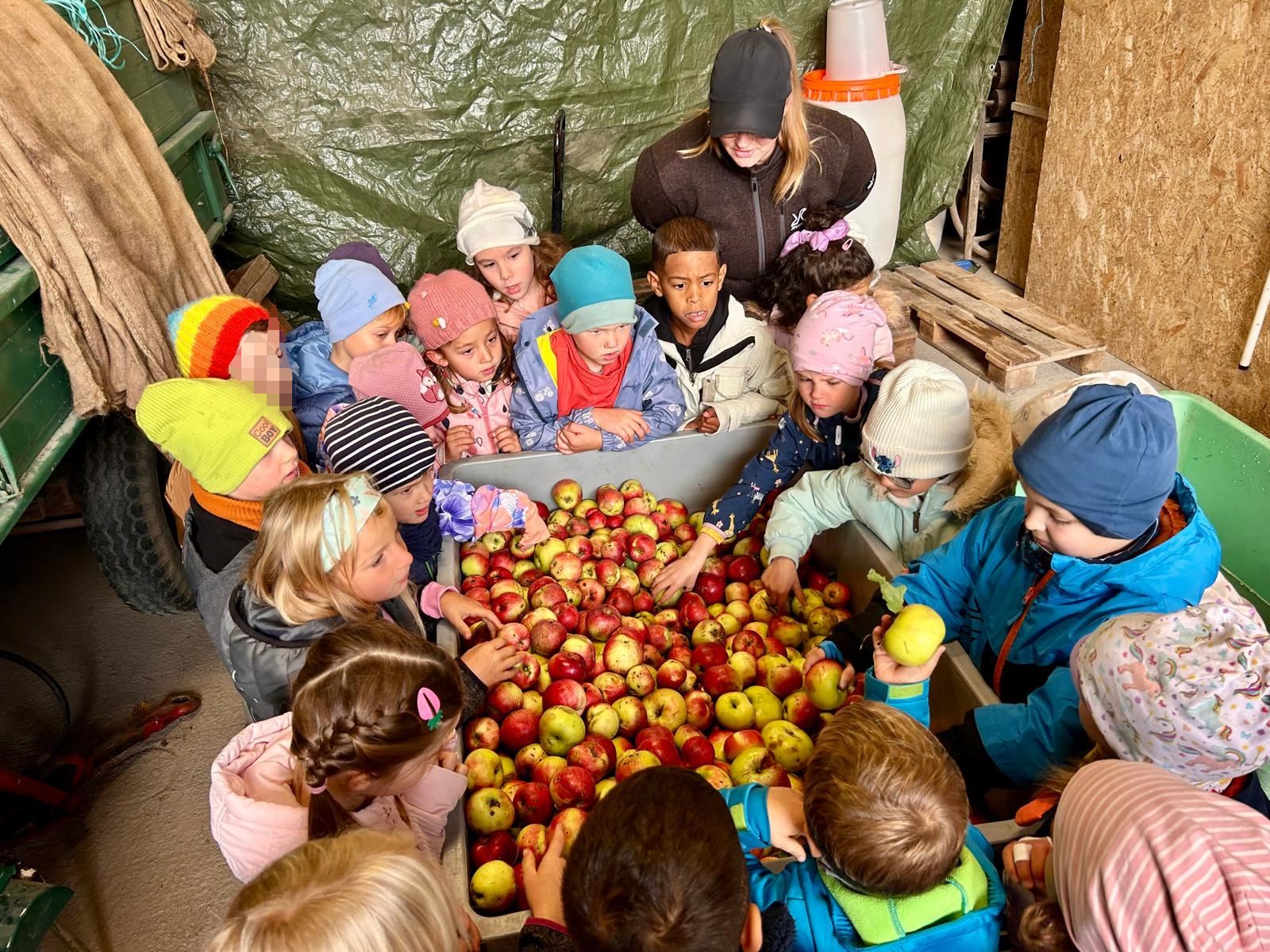 Gemeinsam machten sich am 08. Oktober unsere 24 Tauben aus der Kita Regenbogen auf den Weg, um zu erleben, wie aus Äpfeln frischer Apfelsaft entsteht. Wir wurden herzlich empfangen und durften auch schon gleich loslegen: Die Äpfel, die am Vortag von den Familien gesammelt worden waren, wurden zuerst gewaschen, dann in den Häcksler geschöpft und anschließend in der großen Presse ausgepresst. Dabei durften alle Kinder kräftig mithelfen und staunen, wie der goldene Saft langsam herauslief. Natürlich durfte jeder einmal kosten.