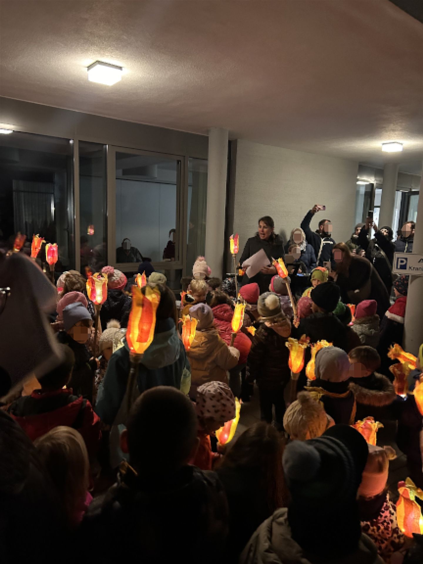 Danach machten wir uns gemeinsam auf den Weg zum Seniorenstift Alexander. Die Kinder sangen im Innenhof ihre Laternenlieder – besonders laut beim „Lichterkinder“-Lied – und die Bewohnerinnen und Bewohner freuten sich sehr über den Besuch.