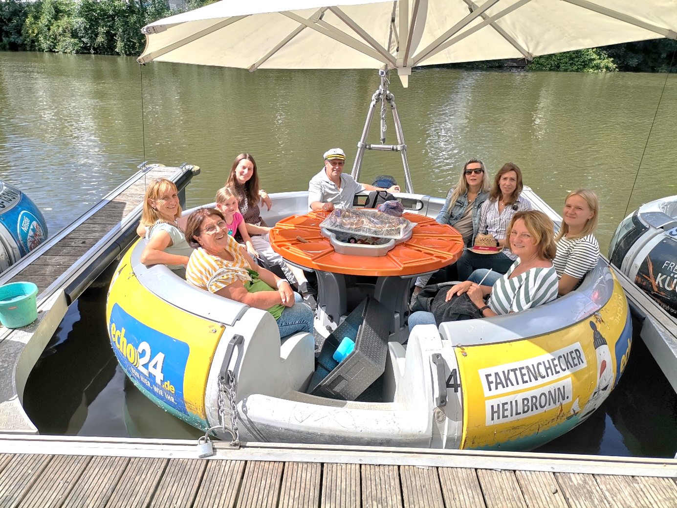 Anlässlich des wohlverdienten Ruhestands von unserer lieben Kollegin H. Hilz hatten wir uns eine besondere Überraschung ausgedacht: Am Mittwoch, 23.07.2025 ging es gemeinsam auf einen BBQ-Donut auf den Neckar! Bei schönem Wetter, einer leckeren Partybrezel und guter Stimmung verbrachten wir einige fröhliche und unvergessliche Stunden auf dem Wasser. Ein gelungener Abschied voller Lachen, guter Gespräche und schöner Erinnerungen.